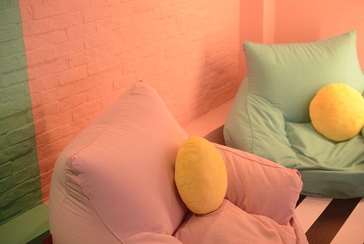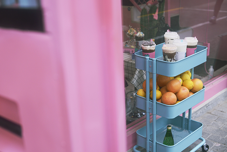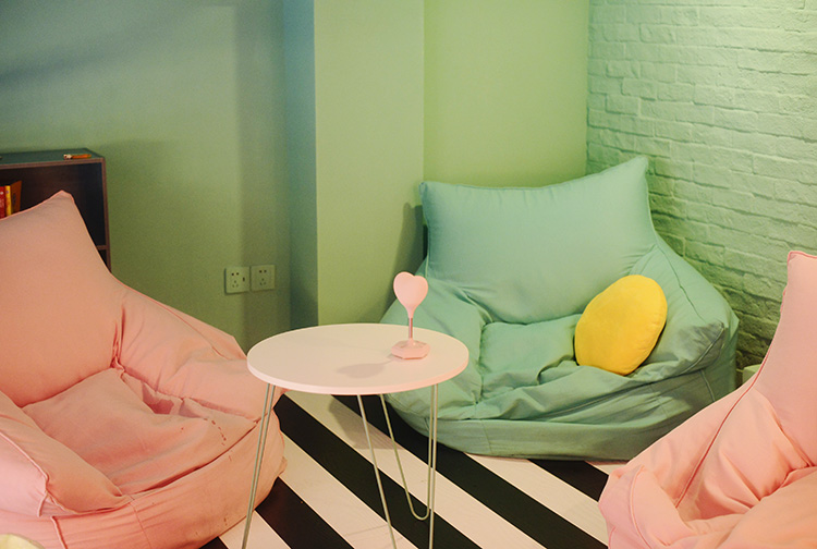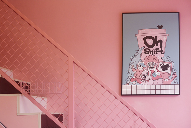 Oh ShiFt位于复兴中路,粉蓝撞色的门店在路边十分惹人注目,进入店内需要开启一扇酷似自动售货机的粉色门,玻璃小橱窗内放置着可爱的小摆件。店内充斥着蒸汽波元素,黑白格墙壁与桌布,透明的座椅,仙人掌上挂着粉色豹,还有挂在墙上的霓虹灯,活泼又少女。二楼是一个小阁楼,摆放着粉蓝相间的懒人沙发,可以慵懒的躺着度过属于少女的午后。