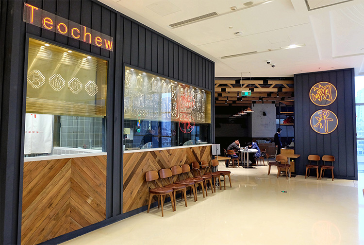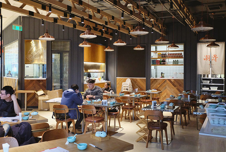 潮界新店坐落于凯德晶萃广场的三楼,店内的设计延续的之前的风格,小桌紧凑排列,在空间布局中显得极具烟火气,故意做旧的墙面和暖调灯光甚至营造出了一种夜市排挡的感觉,不会让用餐的客人产生距离感;每日午市都是人声鼎沸,用餐氛围亲切感十足。