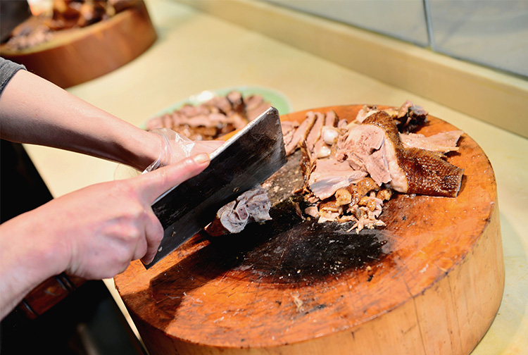 潮汕菜的烹饪讲究用料和制作的绝对精细,在看似普通的菜品中将细节处理到极致;潮界的门口就是半开放式的切配室,在这里你可以近距离观看到店内招牌“卤狮头鹅拼盘”的制作过程:肥美鲜嫩的狮头鹅在潮汕师傅娴熟利落的刀工下被切成均匀薄片,鹅肉纹理均匀细致,鹅皮上的油脂在灯光下反射下让人不经意间就产生出食欲上的冲动;未尝其味,先在视觉上得到极致享受。